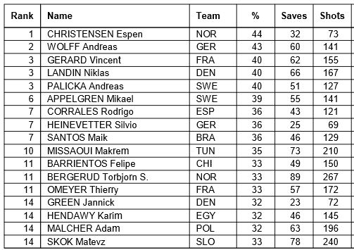 Roligt att se både Andreas Palicka och Mikael Appelgren högt upp i listan. Det ger att Sverige har det bästa målvaktsparet i hela VM då ingen annan nation har båda sina målvakter så högt upp. Tyskland med Andreas Wolff och Silvio Heinevetter ligger närmast efter Sverige i det hänseendet.